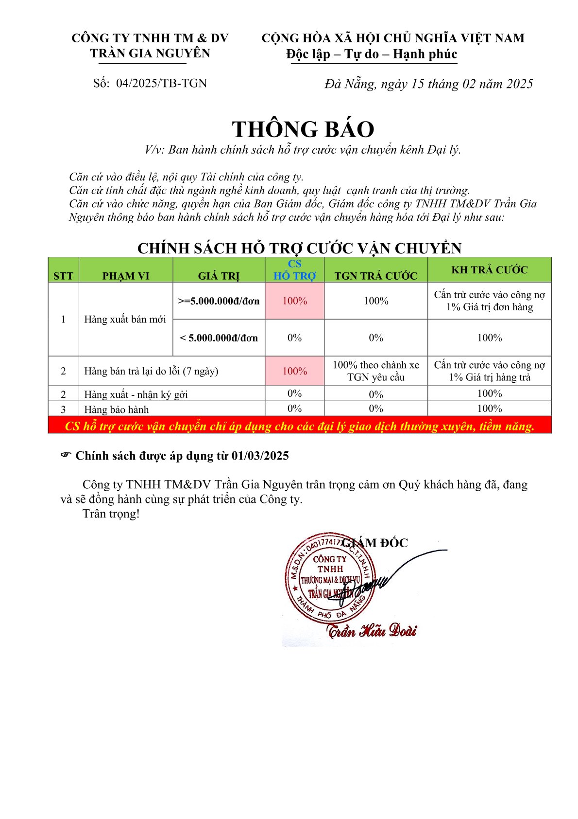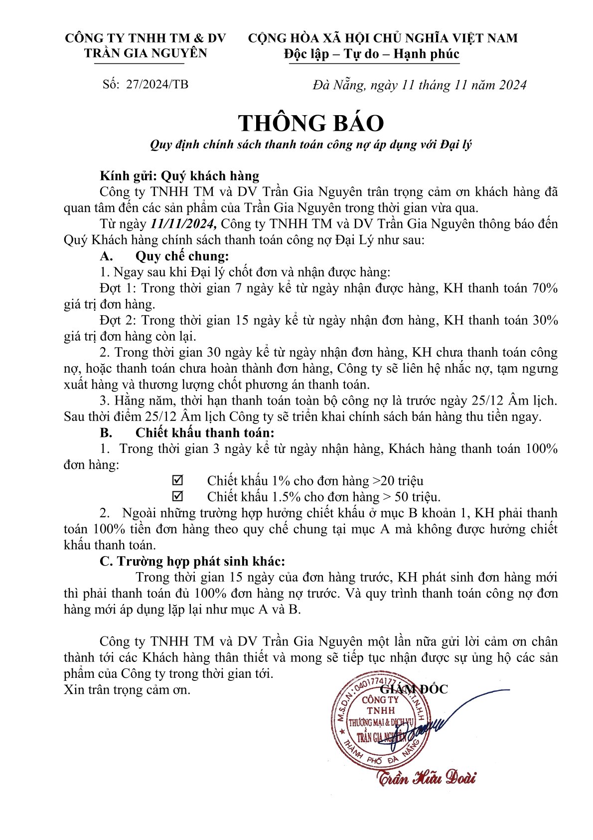 - Trong trường hợp Nhà sản xuất/ Nhà phân phối tăng giá Bán, Quý đại lý được thông báo trước tối thiểu trong vòng 03 tối đa 07 ngày để có chính sách nhập hàng cho phù hợp.