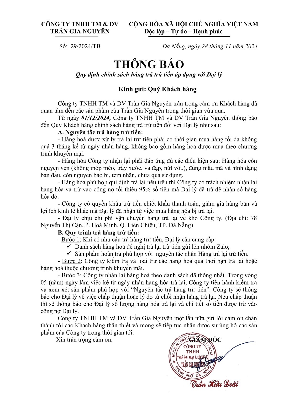- Trả hàng: Trong trường hợp hàng hóa, giá cả không đúng với thỏa thuận mua hàng, Quý đại lý có quyền trả lại hàng cho Nhà phân phối. Việc trả hàng được thực hiện trong vòng 7 ngày kể từ ngày giao nhận hàng và có chứng từ xác nhận giao nhận hàng hóa.