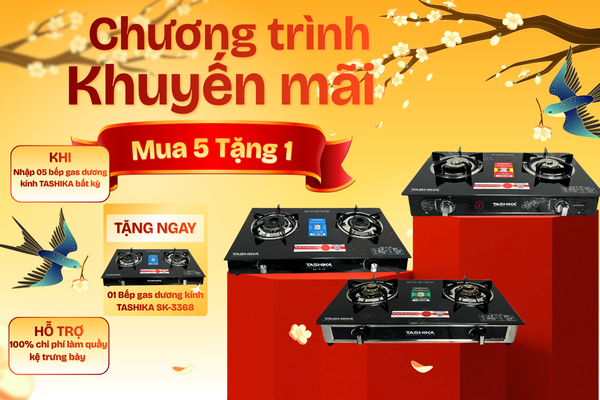 Mua 5 bếp gas TASHIKA – Tặng ngay 1 bếp gas dương kính TASHIKA. Chương trình khuyến mãi đặc biệt dành cho đại lý, cửa hàng. Khi nhập 05 bếp gas TASHIKA bất kỳ, khách hàng được tặng ngay 01 bếp gas dương kính TASHIKA Model SK-3368.