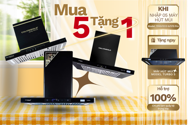 Chương trình ưu đãi lớn dành cho hệ thống phân phối và Đại lý. Khi nhập 05 máy hút mùi CALVINGOLD Model 7050 ECO / 6570 Pro, khách hàng được tặng ngay 01 máy hút mùi CALVINGOLD Model Turbo S.