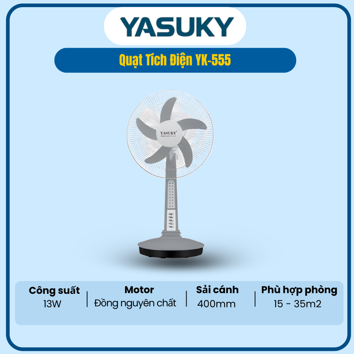 YK-555 là quạt tích điện dạng đứng, sải cánh lớn cho luồng gió mạnh và đều. Thiết kế chắc chắn, dễ sử dụng, phù hợp phòng khách, phòng ngủ và khu sinh hoạt chung.