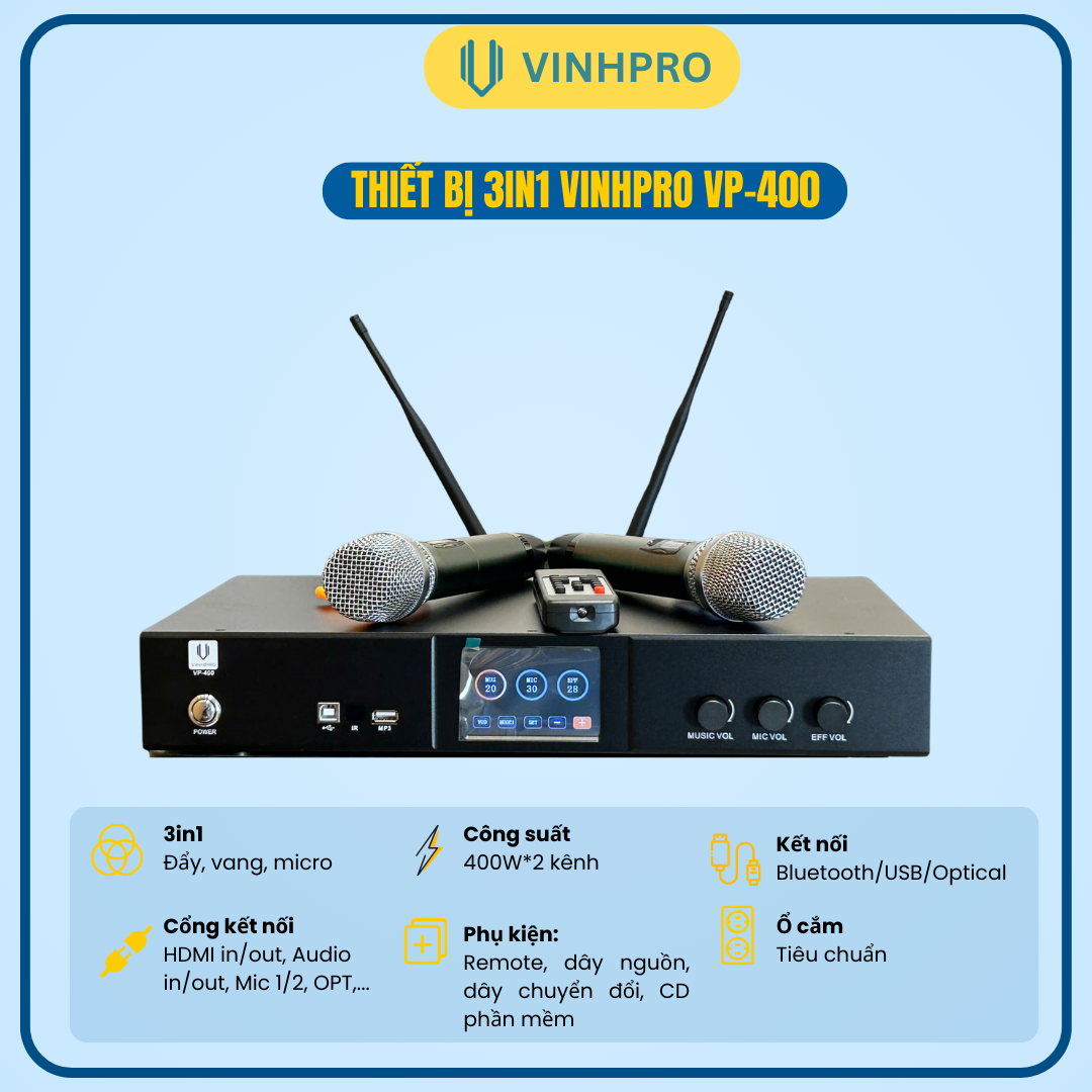 VINHPRO VP400 là mẫu đẩy karaoke 3in1 cao cấp, tích hợp đẩy công suất – vang số DSP – micro không dây trong cùng một thiết bị, giúp người dùng tối ưu không gian và mang lại trải nghiệm karaoke chuyên nghiệp tại gia.
